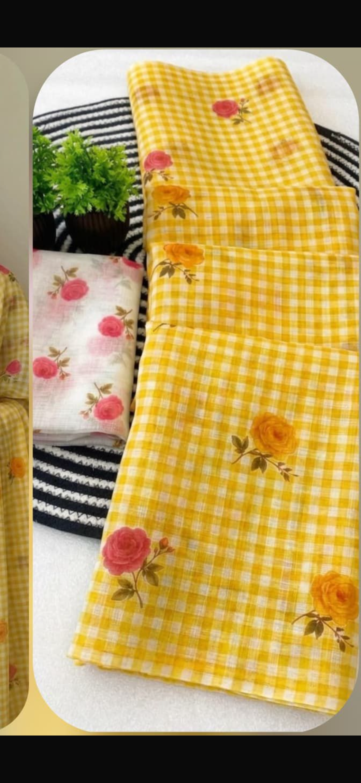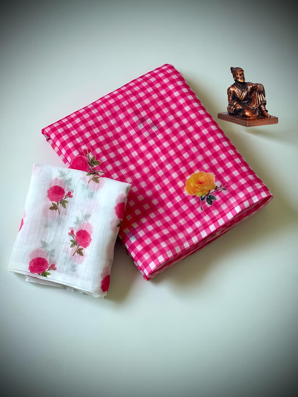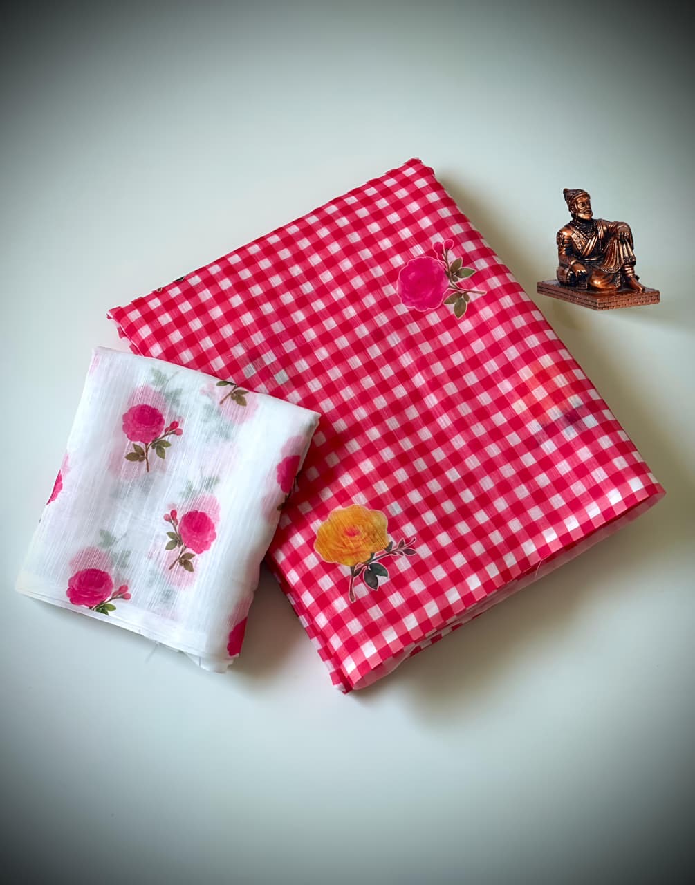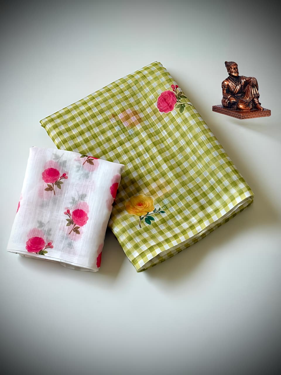*🥻 Saree Fabric: Heavy linen chex blooming saree with flora digital print on allover saree attached with PERFECTLY MATCHED blouse piece and pallu*