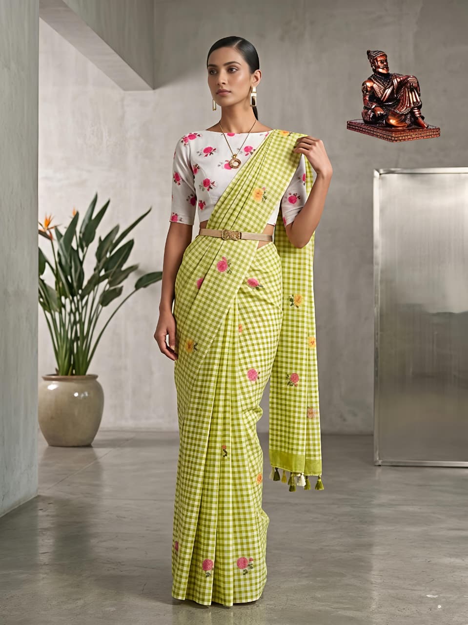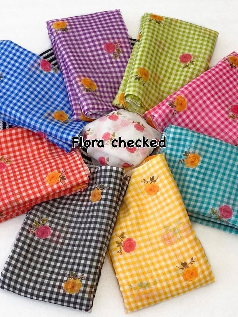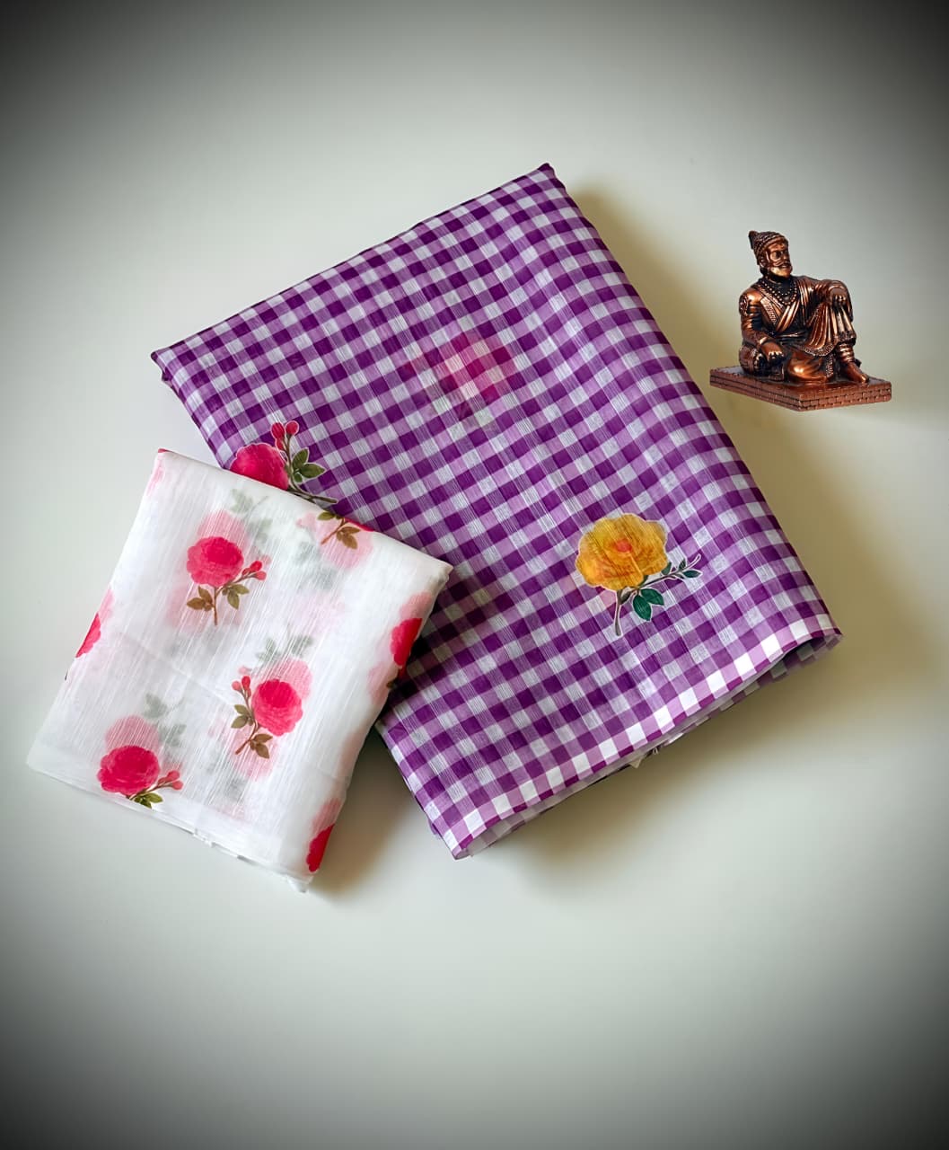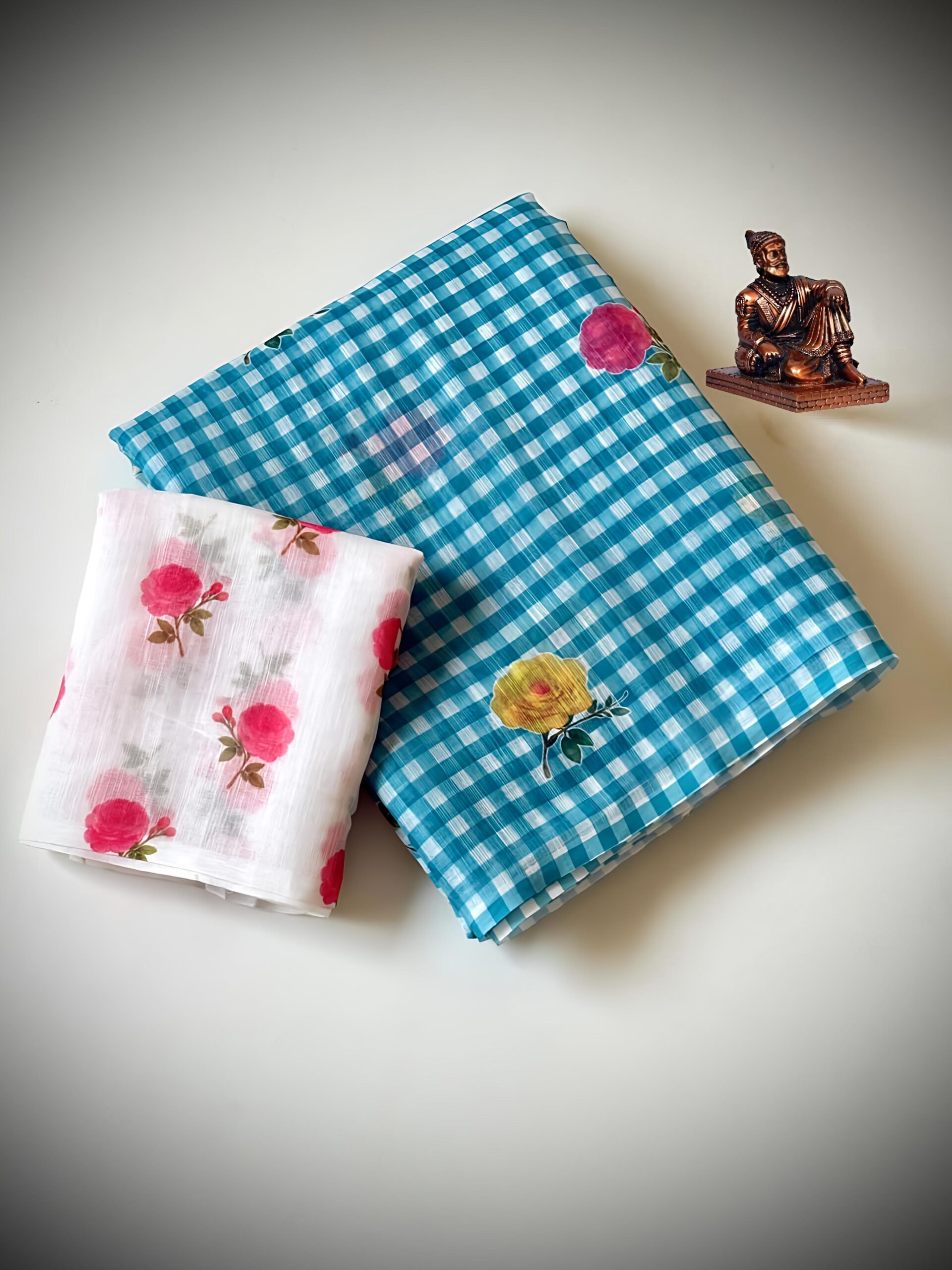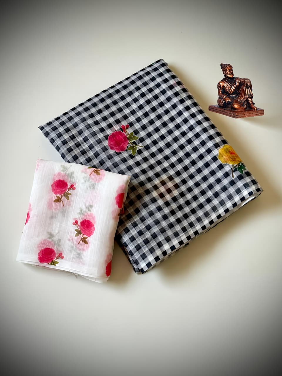 *🥻 Saree Fabric: Heavy linen chex blooming saree with flora digital print on allover saree attached with PERFECTLY MATCHED blouse piece and pallu*