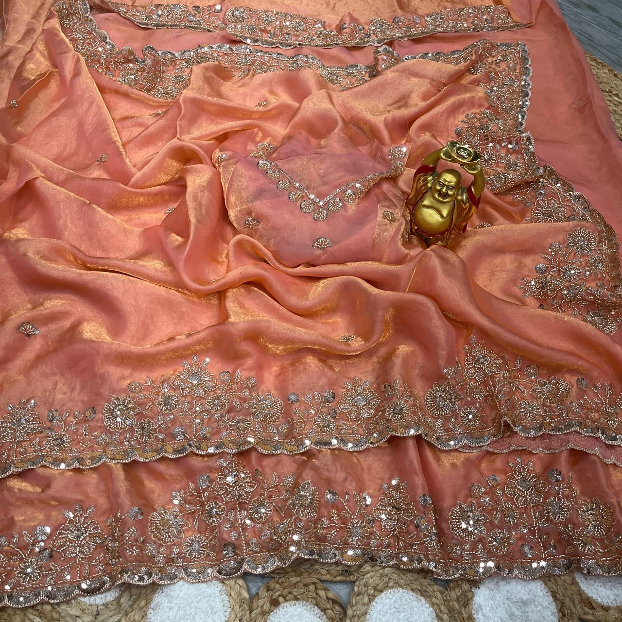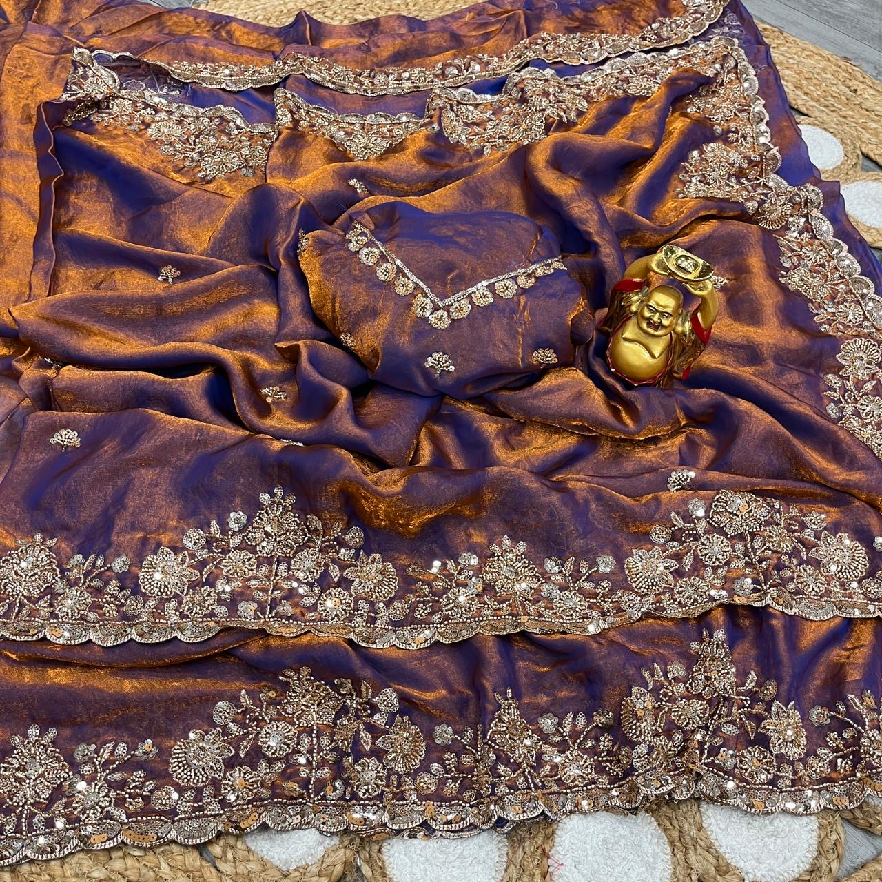 Launch Grand party wear saree in original gold beeds work