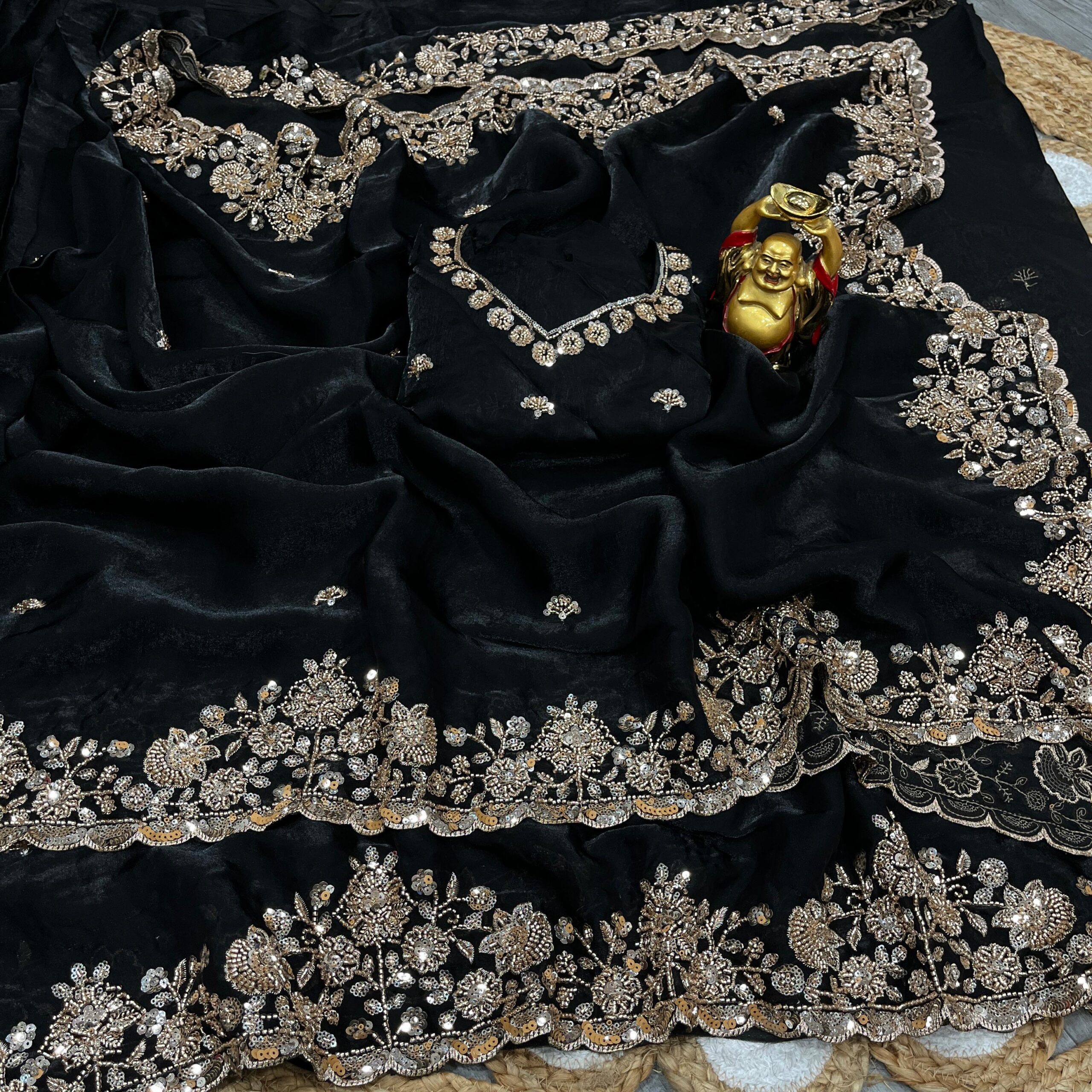 On pure space silk sarees in velvet shine adorned with sequence and cutdana delicate handwork