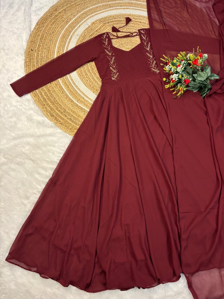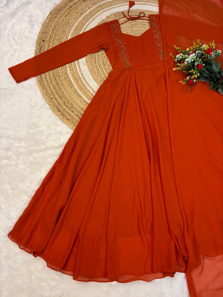 Faux Georgette gown with beautiful hand work .the yoke part fully designed for pintucks work.This perfect party wear for upcoming festivals and functions